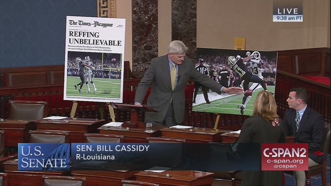 Cassidy (R-LA) from Senate floor on Saints-Rams game: “What happened in my belief and the belief of many was the most blatant and consequential blown call in NFL history.” pic.twitter.com/rbWJQtx0ny