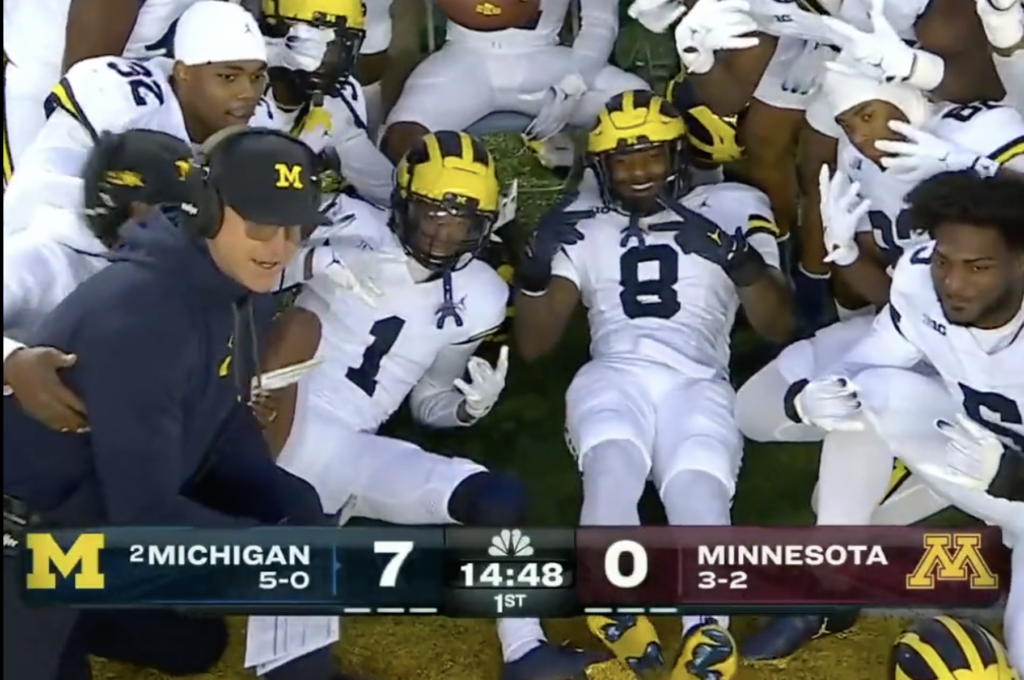 During Saturday night’s game against the Minnesota Golden Gophers, Harbaugh celebrated a pick-six with his team by running all the way down to the end zone and take part in a group photo.