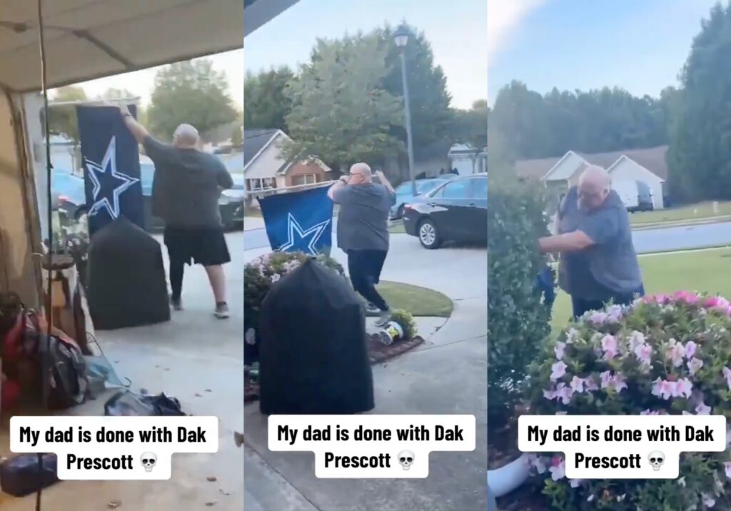 A Cowboys fan shared a video of her angry dad ripping a Cowboys flag off their house and shoving it into the bushes in disgust.
