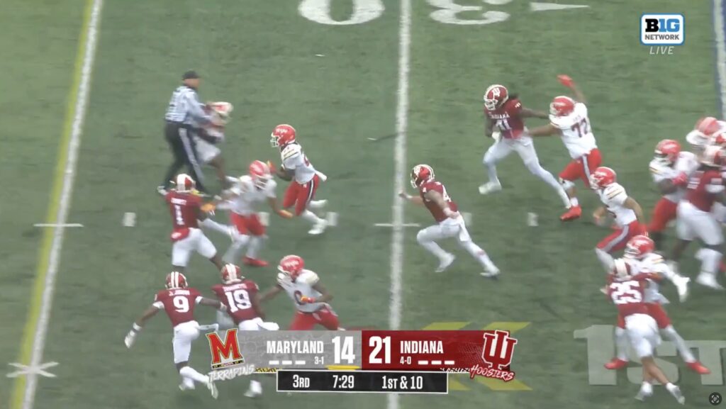 Midway through the third quarter, running back Roman Hemby ripped off a 75-yard touchdown run to tie the game at 21. He got a bit of help from a referee, though, as he inadvertently threw a perfect block to free up Hemby and allow him to get to the end zone for Maryland.