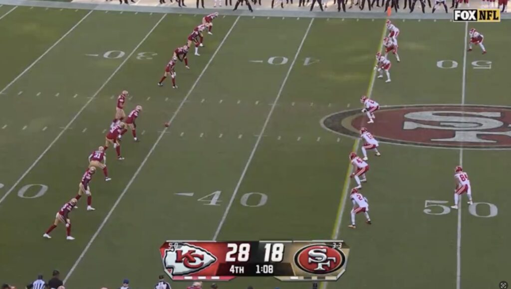 Trailing 28-18 with 1:08 remaining in the game, the San Francisco 49ers lined up to kick an onside kick. That attempt might go down as the worst onside kick attempt in NFL history.