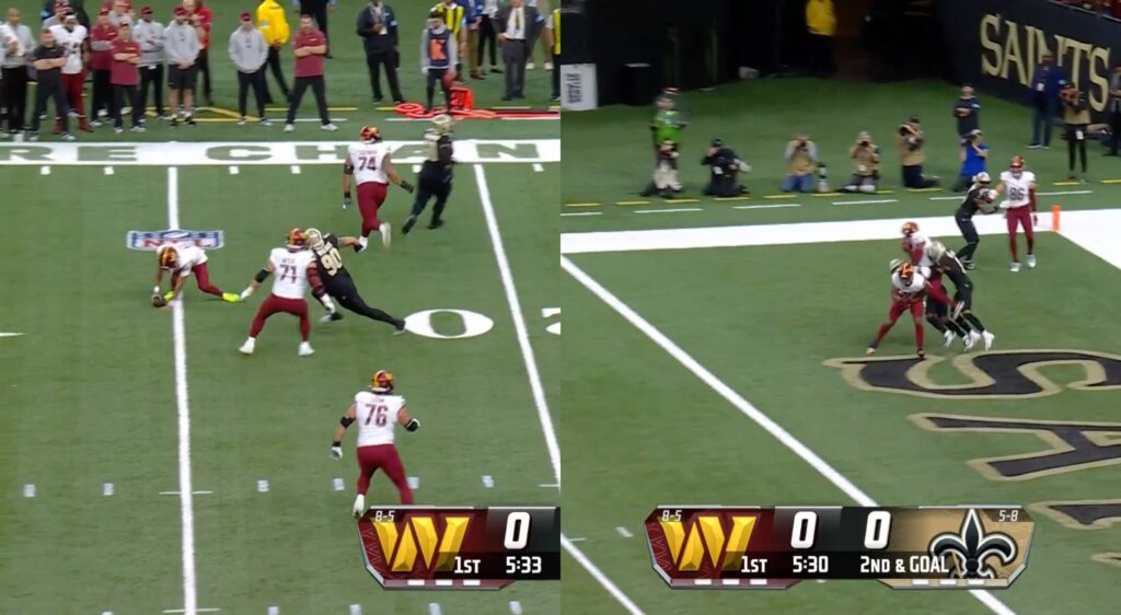 During the first quarter of Sunday’s game against the New Orleans Saints, Daniels ran around to evade Saints defenders, stumbled, and threw an absolute dart to Terry McLaurin for a touchdown.