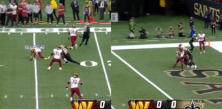Jayden Daniels Stumbles And Throws A Dart To Terry McLaurin For...