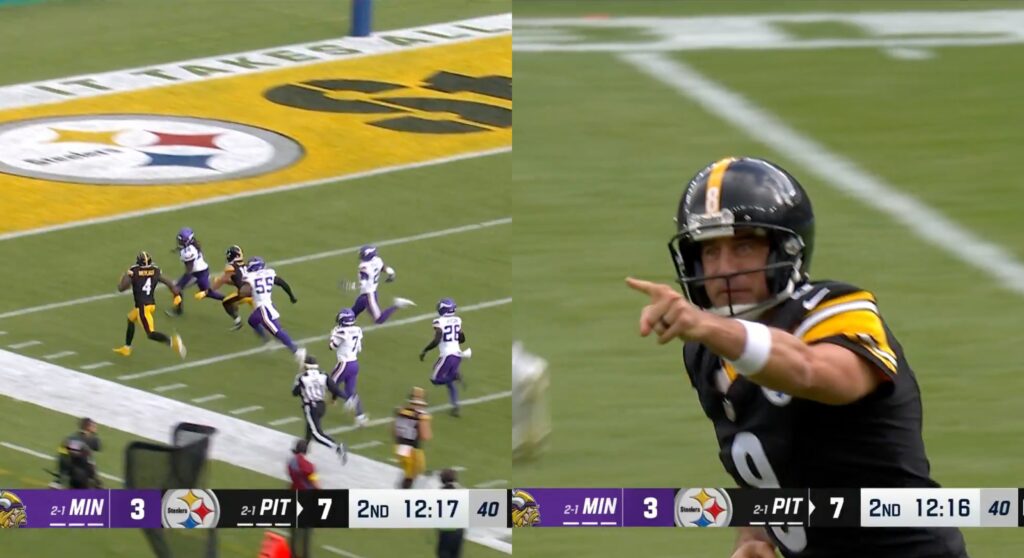 Early in the second quarter, Aaron Rodgers hit D.K. Metcalf in stride who raced to the end zone for an 80-yard touchdown to give the Steelers a 14-3 lead.