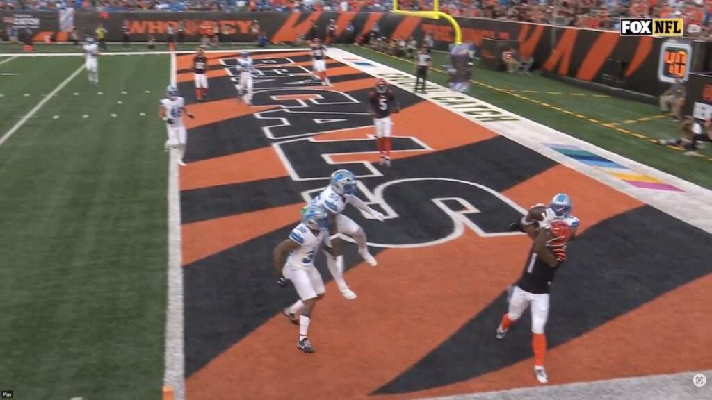 During Sunday’s game against the Detroit Lions, Bengals quarterback Jake Browning threw the ball up for Chase, who somehow came down with a ridiculous toe tapping touchdown.