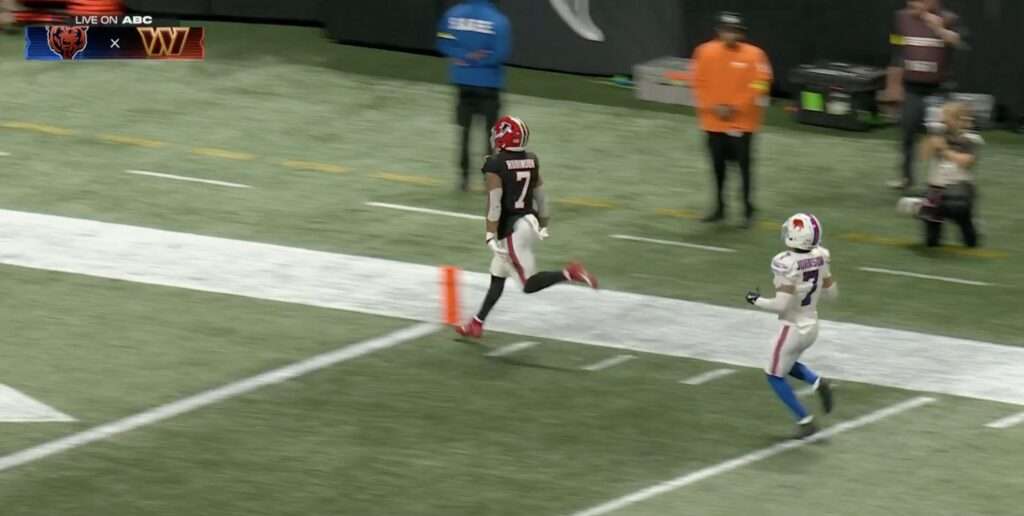 The Atlanta Falcons are running all over the Buffalo Bills defense. During the second quarter and already up 14-7 on Buffalo, Bijan Robinson goes 80-yards right through the Bills defense to put the Falcons up, 21-7.
