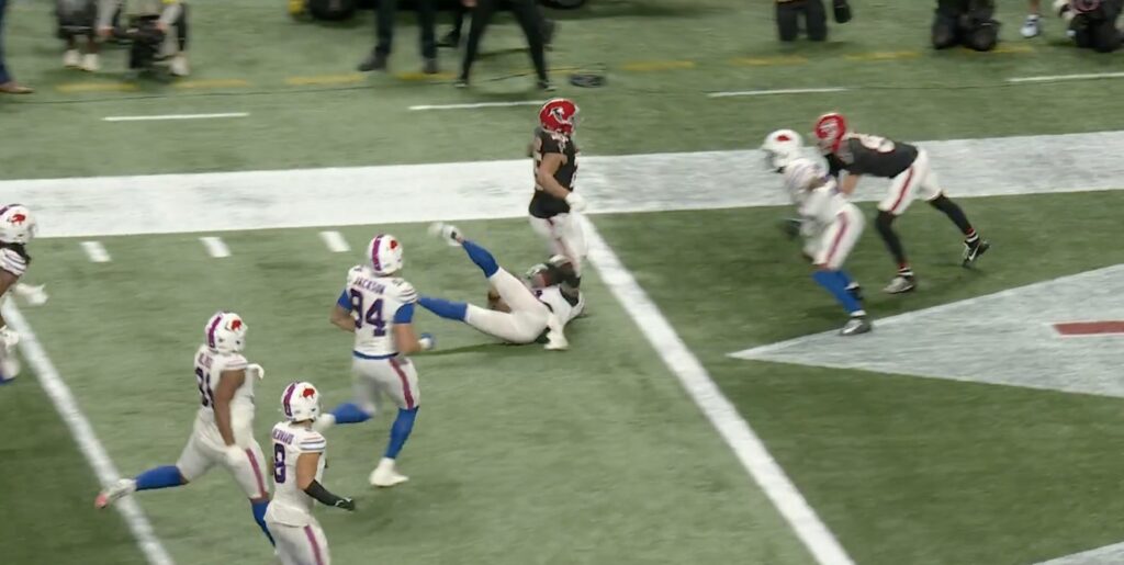 After driving down the field, the Falcons capped off their opening drive with a 21-yard touchdown run by Tyler Allgeier, who laid out Buffalo Bills safety Tyler Rapp with a vicious truck stick hit.
