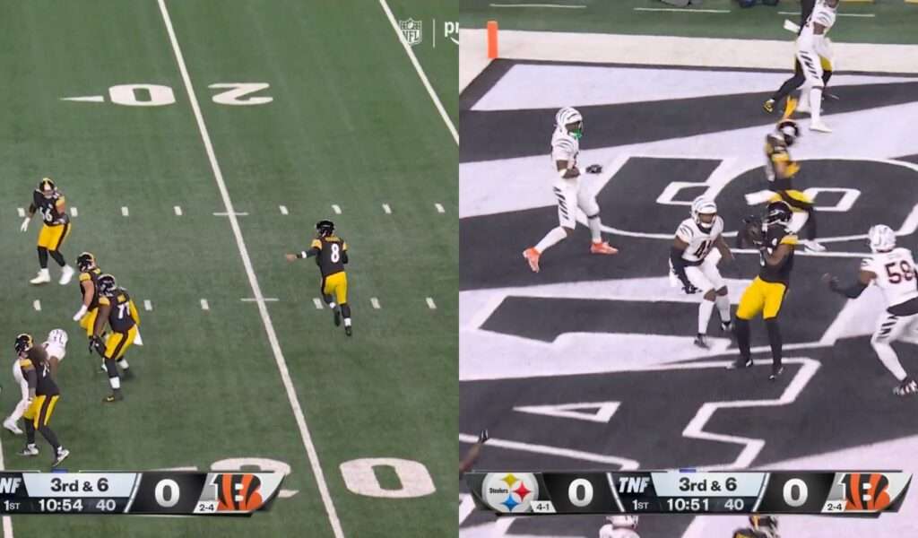 On the first drive of Thursday night’s Steelers-Bengals game, the Steelers faced a 3rd and 6 and Rodgers was able to extend the play, scramble around and throw an absolute dart to tight end Jonnu Smith for a touchdown.