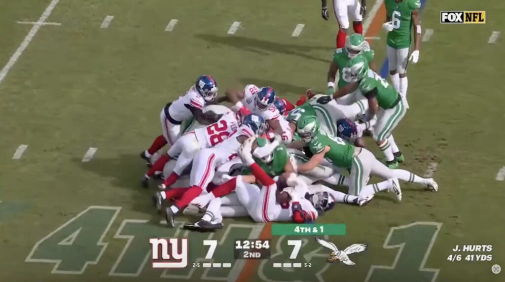 The Eagles’ signature play came under scrutiny again on Sunday when Jalen Hurts appeared to have clearly fumbled on a 4th and 1 ‘Tush Push’ play after Giants’ linebacker Kayvon Thibodeaux clearly ripped the ball out of his hands while Hurts was clearly still pushing forward.