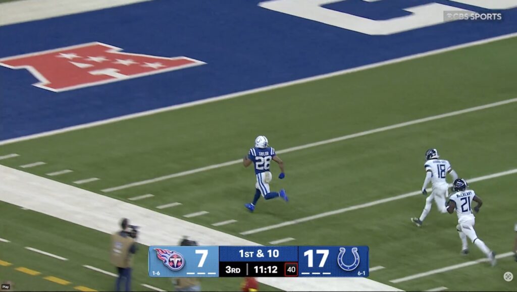 During the third quarter of Sunday’s game against the Tennessee Titans, Taylor broke free and went 80 yards for a house call touchdown.