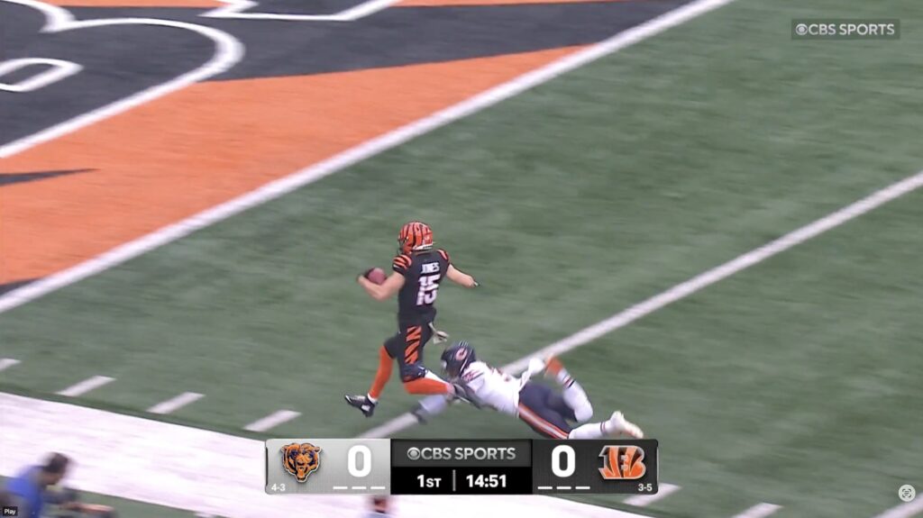 Home Sports Football Bengals’ Charlie Jones Takes Opening Kickoff 99-Yards For A Touchdown vs Bears... Bengals’ Charlie Jones Takes Opening Kickoff 99-Yards For A Touchdown vs Bears (VIDEO) By Randy Oliver - November 2, 2025 FacebookTwitterPinterestWhatsApp What a start for the Cincinnati Bengals. Bengals kick returner Charlie Jones took the opening kickoff 99 yards to the house. CHARLIE JONES 99 YARDS ON THE OPENING KICKOFF!CHIvsCIN on CBS/Paramount+https://t.co/HkKw7uXVnt pic.twitter.com/E2vmpv7kZU— NFL (@NFL) November 2, 2025 RELATED ARTICLESMORE FROM AUTHOR Football Jaguars DE Travon Walker Ejected For Throwing Sucker Punch In Game vs Raiders (VIDEO) Football Jaguars’ Cam Little Breaks The NFL Record With 68-Yard Field Goal vs Raiders (VIDEO) Football The Bears-Bengals Game Was Absolutely Insane Football Panthers Upset The Packers With A Game-Winning 49-Yard Field Goal In Incredibly Windy Conditions Football Chargers’ Joe Alt Carted Off After Suffering Serious Leg Injury vs Titans (VIDEO) Football Bears Run A Trick Play With DJ Moore Throwing A TD Pass To Caleb Williams vs Bengals (VIDEO) Football Aaron Rodgers Suffered A Hand Injury During Pregame Warmups Before Game vs Colts (VIDEO) Football Eagles Acquire CB Jaire Alexander From Baltimore Ravens Football REPORT: Dolphins Place WR/CB Travis Hunter On Injured Reserve Due To Knee Injury