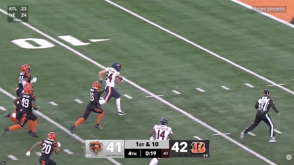 With the Bears desperately trying to get into field-goal mode, Caleb Williams found Loveland in the middle of the field, and he rumbled all the way to the end zone to save the Bears and give them the 47-42 win.