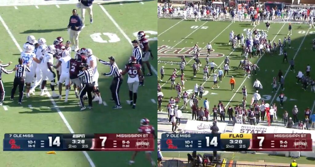 Pure chaos broke out in Thursday’s Egg Bowl between No. 7 Ole Miss and Mississippi State when benches cleared during an on-field fight.