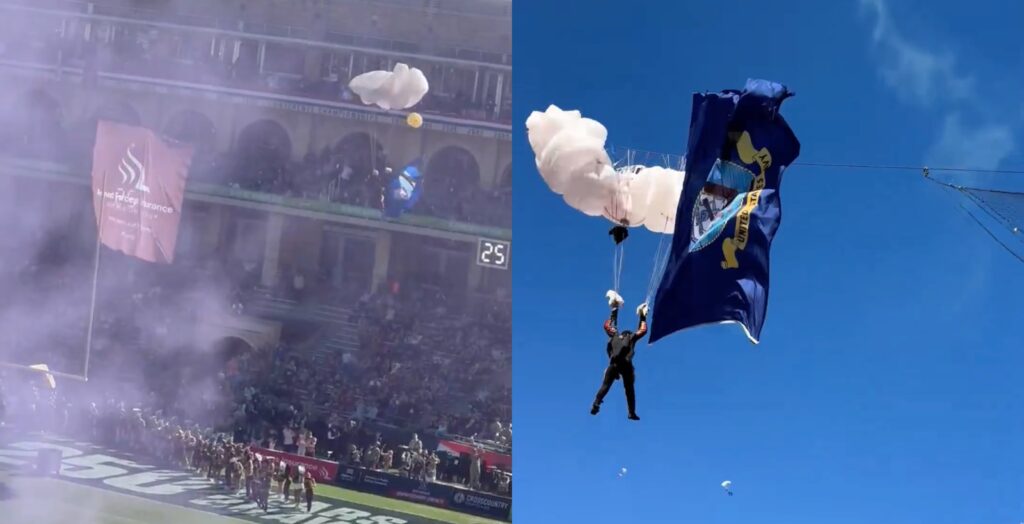 According to reports, one parachutist landed outside the stadium, while others landing behind the end zone and onto the portion of the field that separates the stands from the field. Thankfully, no injuries resulted from the incidents among those who were standing on the ground behind the end zone.