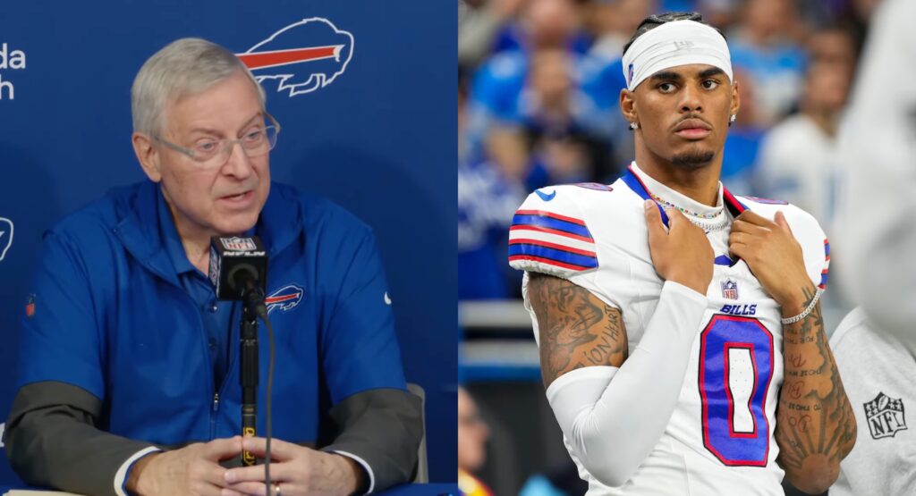 A reporter asked Brandon Beane a question about the lack of talent surrounding Josh Allen and before Beane could answer, Pegula interrupted to address the “Keon Coleman situation” by saying it was the coaching staff that pushed to draft Coleman in the second round of the 2024 Draft and Beane was being a “team player.”