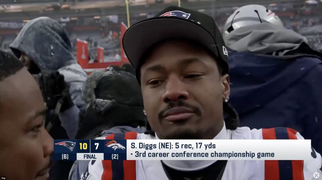 The Patriots had just 206 yards of total offense in the win, holding Denver to 181 yards in a game that was overtaken by snow late in the third quarter. Diggs made two receptions for 17 yards.